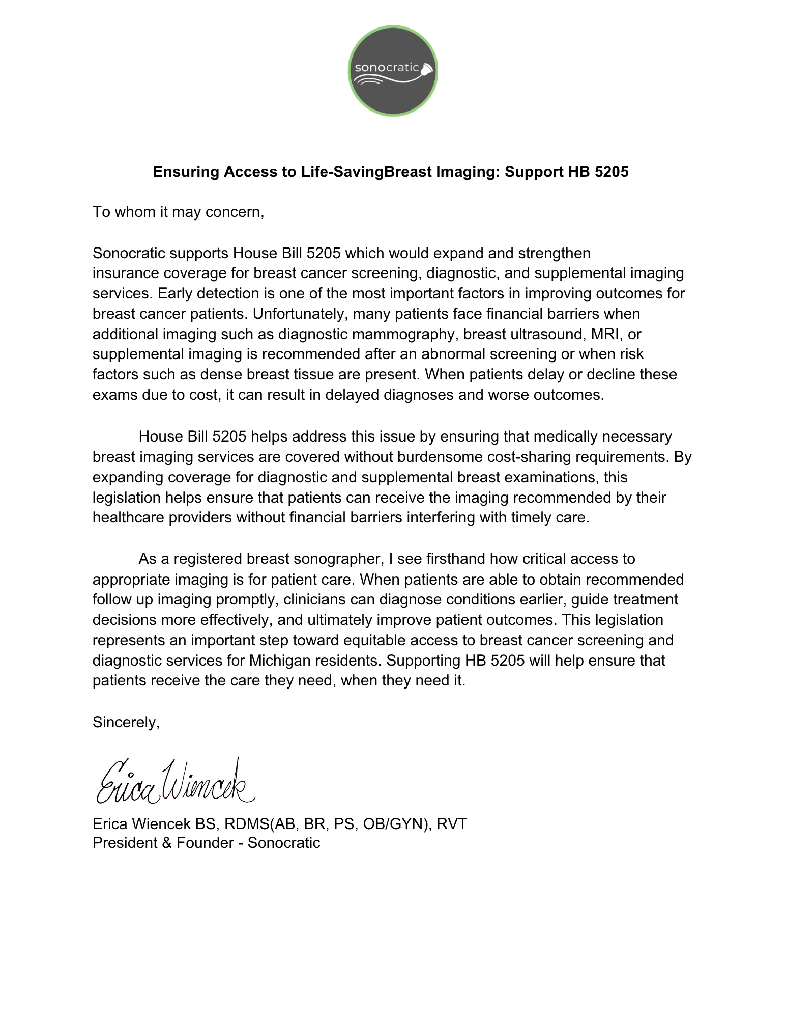 Michigan House Bill 5205 would expand and strengthen insurance coverage for breast cancer screening, diagnostic, and supplemental imaging services without patient cost sharing. Many states already have such legislation in place, Sonocratic supports HB 5205 to ensure Michigan patients have access to timely care without financial burdens
