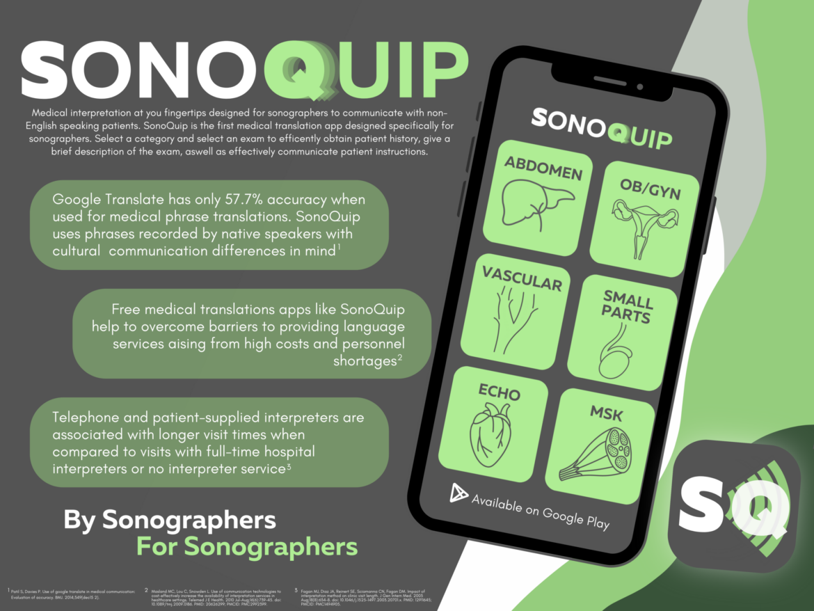 Medical interpretation services are not always readily accessible to sonographers, particularly in low-resource environments. SonoQuip was created to help bridge this communication gap. The app functions as a multilingual soundboard of common ultrasound phrases and instructions, allowing sonographers to communicate essential exam guidance with patients who have limited English proficiency.